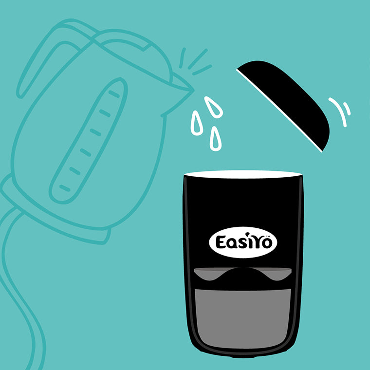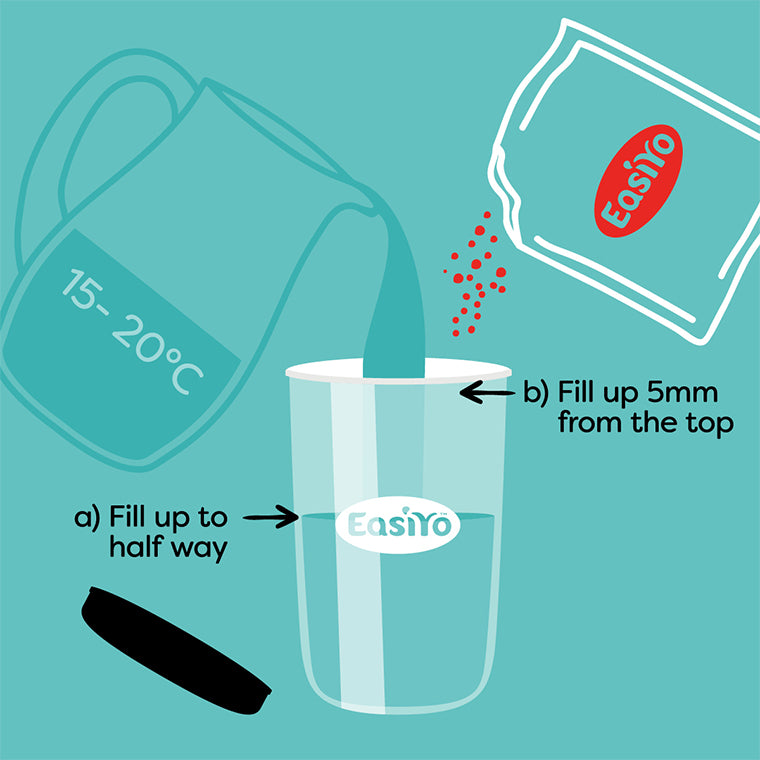 Half fill your yogurt jar with room temperature drinking water (15-20°C). Add the contents of the yogurt sachet, pop on the lid and give it a good shake. Add more water to the jar until it’s about 5mm from the top… pop on the lid and shake again.